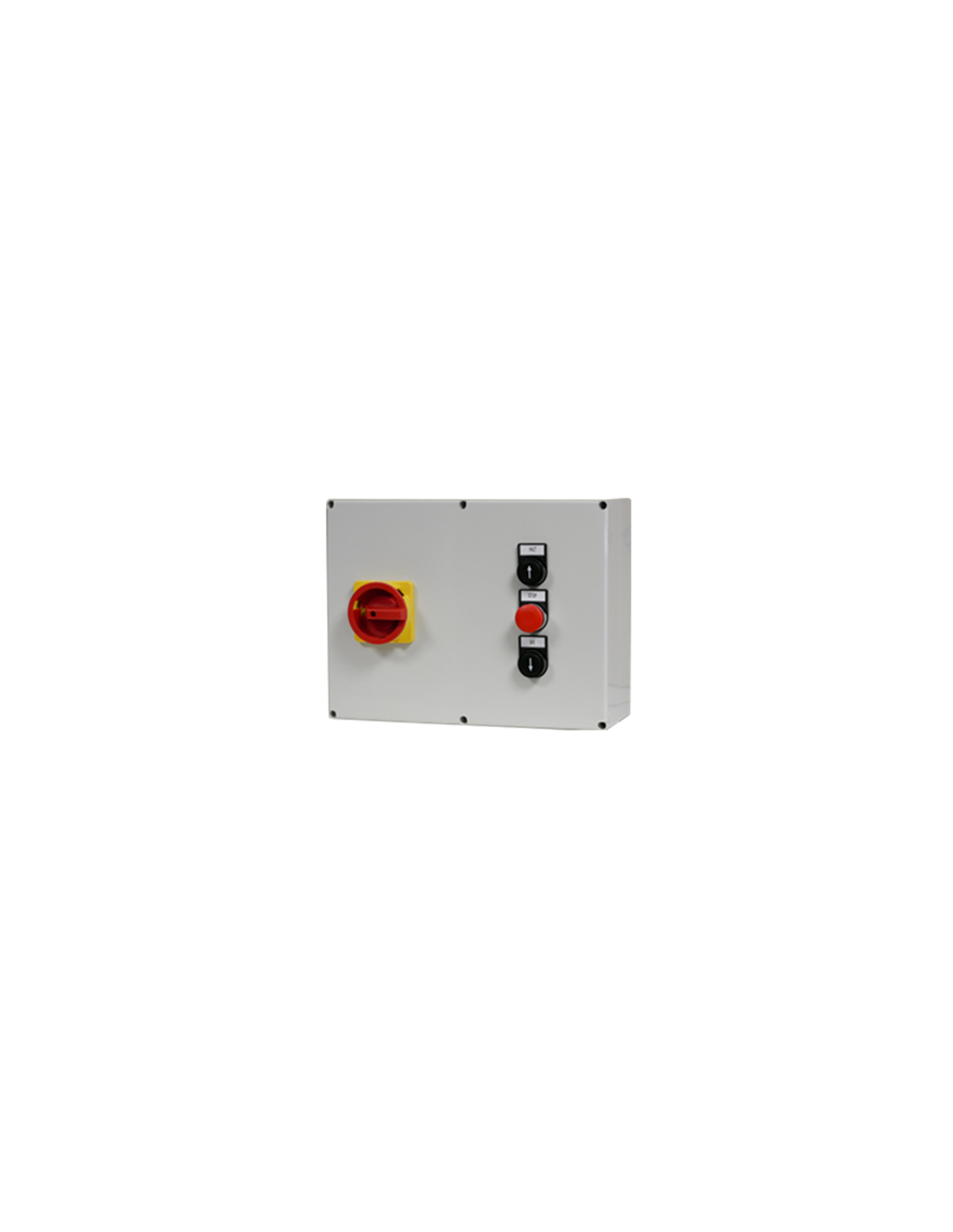 Ce boîtier de démarrage moteur permet d'inverser le sens de rotation des moteurs triphasés. On utilise pour cela un bouton flèche du haut ou flèche du bas. Quand le bouton poussoir est enclenché vers le haut (flèche du haut) la commande à lieu jusqu’au fin de course sauf dans le cas de l'utilisation de l'option impulsionnelle intégrée. Il faut pour cela utiliser le switch à l'intérieur pour déconnecter l'automaintient.