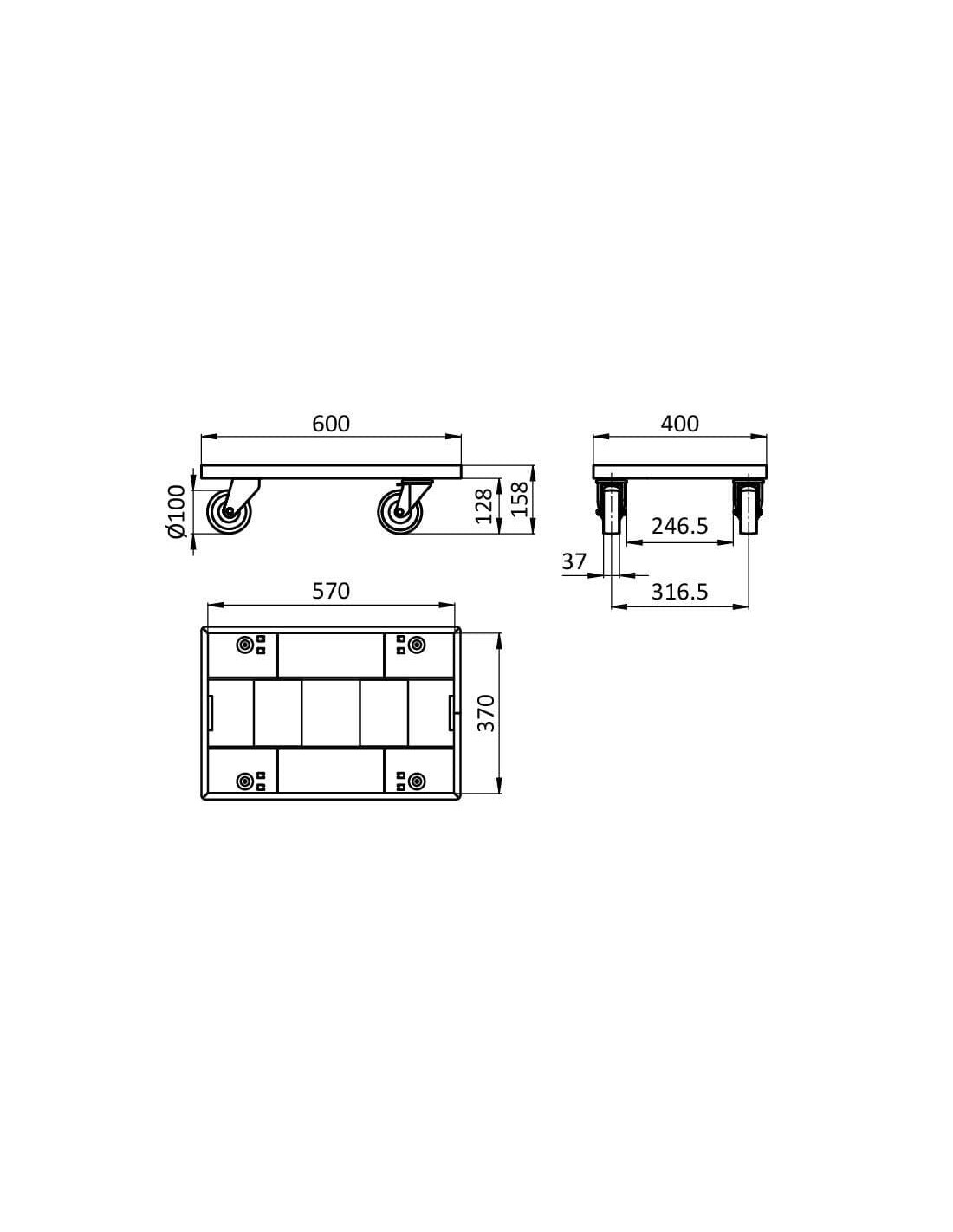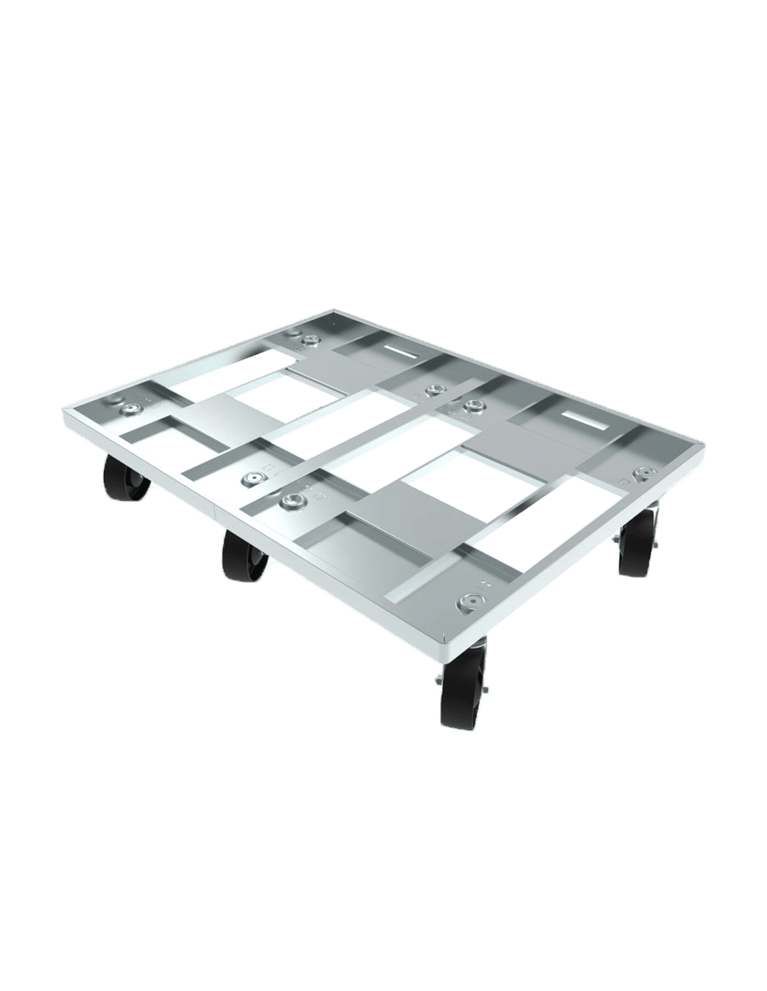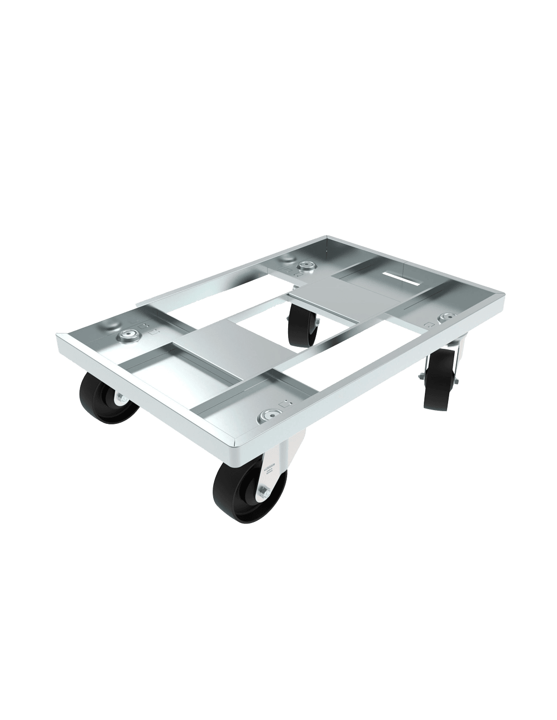 Version 4 roulettes (2 orientables + 2 fixes) pour les modèles 600x400mm; ou 5 roulettes orientables pour les modèles 800x600mm.